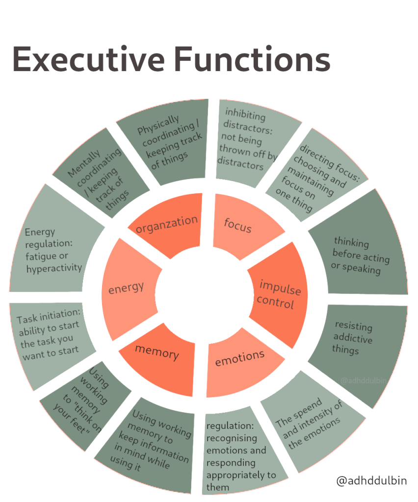 This is a term that refers to a certain set of abilities that seem to be associated with each other. Thomas E. Brown puts them under the headings of memory, emotion, impulsivity, focus and attention, organization, and energy. Someone with executive dysfunction might struggle in some or all of these areas.